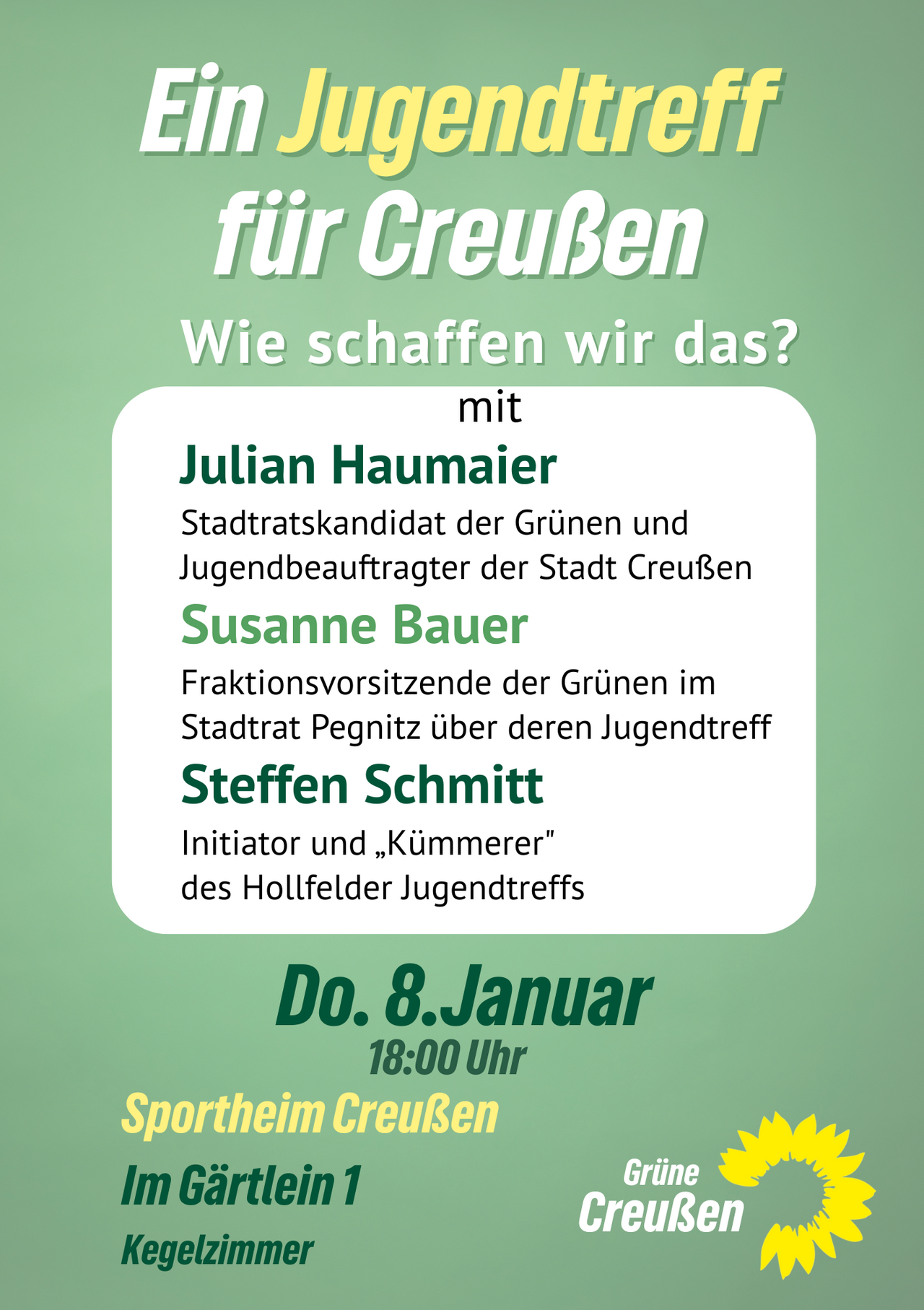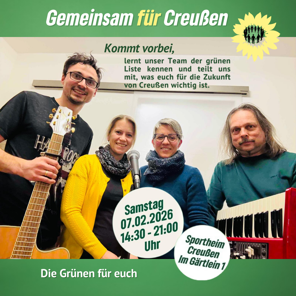 Lernt mich kennen: Am 7. Februar ab 14:30 Uhr im Sportheim Creußen! Musik von unserer Grünen-Band und gute Gespräche inklusive. 🌻