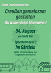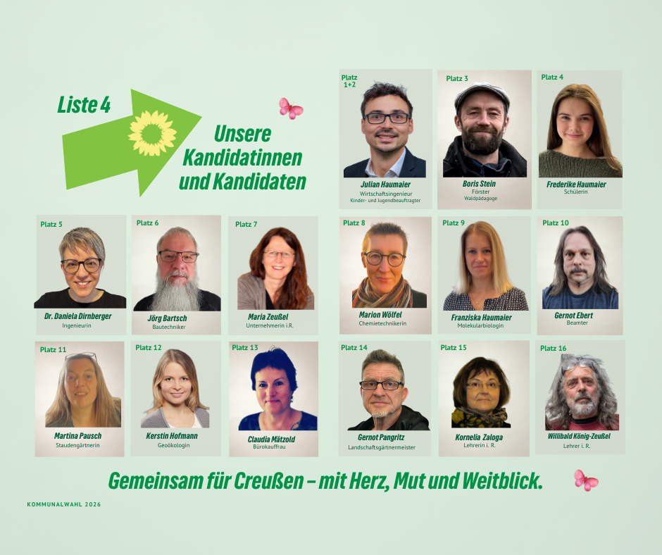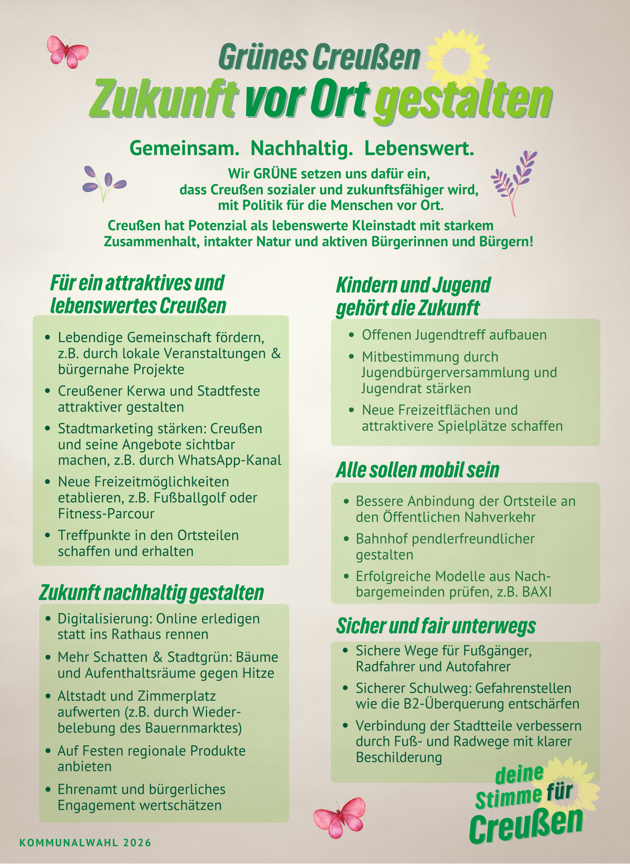 Wir GRÜNE setzen uns dafür ein, dass Creußen sozialer und zukunftsfähiger wird mit Politik für die Menschen vor Ort. Creußen hat Potenzial als lebenswerte Kleinstadt mit starkem Zusammenhalt, intakter Natur und aktiven Bürgerinnen und Bürgern!