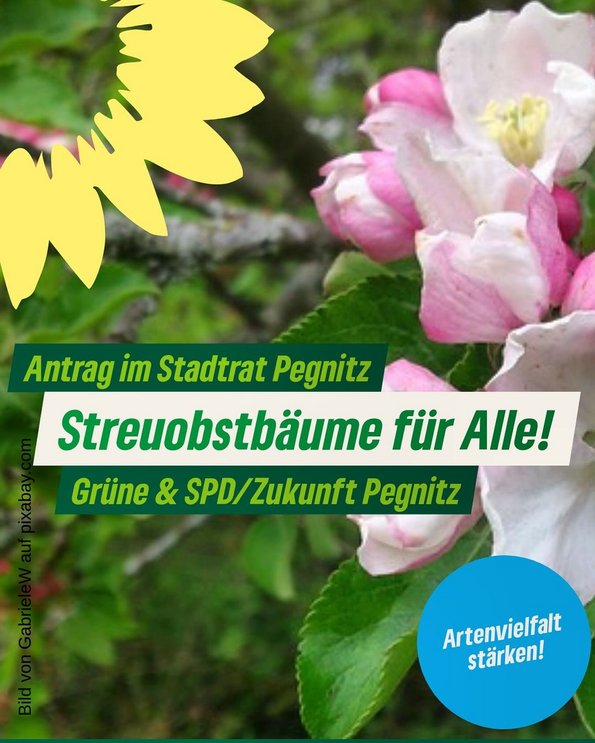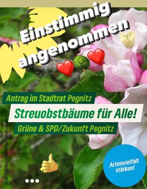 Streuobstbäume für Alle! So heißt unser Antrag im Stadtrat Pegnitz mit dem Streuobstpakt können Bürger*innen für ihre privaten Gärten, aber auch Kommunen für ihre Pflanzungen bestimmte Streuobstbäume kostenlos bekommen: Heimische Sorten, die Artenvielfalt fördern. Diesen Antrag haben wir gemeinsam mit der Fraktion SPD/Zukunft Pegnitz gestellt.